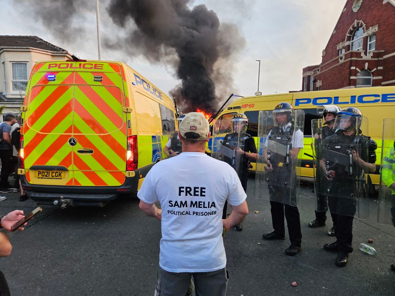 Posts on Hankinson’s account on X (formerly Twitter) reveal he was present at the riot, where he took photographs and recorded videos of the violence. In one gleeful post, which included a video of a burning police van, Hankinson wrote: “‘Piggy in the middle’ Police vans trapped between English People showing solidarity in the face of foreign terror get set on fire by misguided Patriots who take vengence (sic) into their own hands. 🔥”.