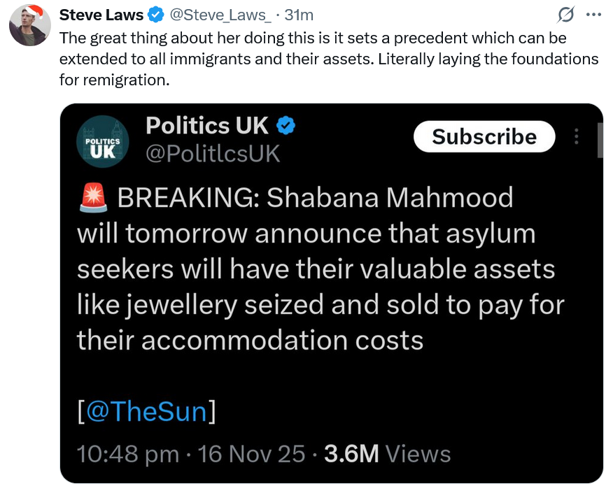 Other more overtly racist activists also celebrated, seeing the proposal as just one step in a longer process that they hope will culminate in the forced expulsion of millions of non-white Britons. Fascist activist Steve Laws - who has gained almost 125,000 followers on X/Twitter and was recently arrested for posts he allegedly made on the platform - wrote that, “The great thing about her doing this is it sets a precedent which can be extended to all immigrants and their assts. Literally laying the foundations for remigration.” Far-right content creator Hugh Anthony, who recently posted a humiliating viral video of his parents kicking him out of their house, levelled a jibe at Mahmood, posting “I’m glad she is pushing us more right… however she will also be deported eventually.”