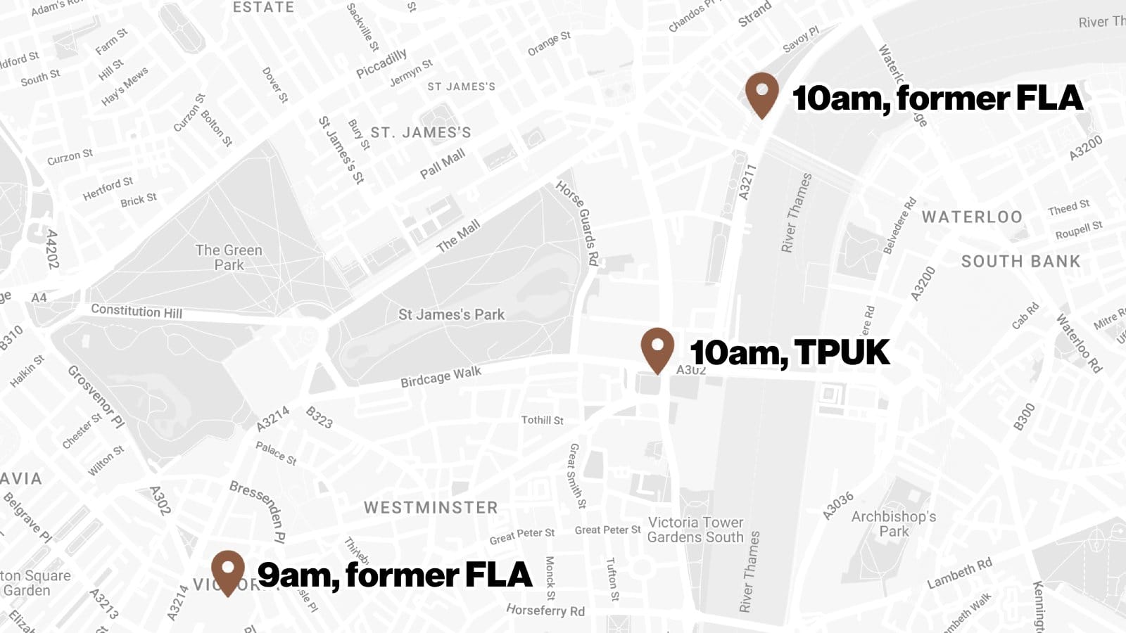 - Embankment tube station (10am, former FLA)