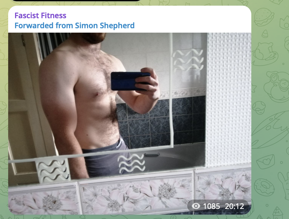 During the same period Shepherd was attending PA’s fitness events in Yorkshire, Kearney was arrested in Spain, extradited to Britain and then charged with two counts of disseminating terrorist publications. Kearney ran a ‘Fascist Fitness’ Telegram channel, in which attendees of PA’s fitness events used to post topless selfies. On two occasions, Kearney shared links in the channel to far-right terrorist manifestos and other documents relating to neo-Nazi terrorism. Kearney pleaded guilty and has been jailed for four years and eight months. Shepherd was a member of and regular contributor to Kearney’s ‘Fascist Fitness’ channel.