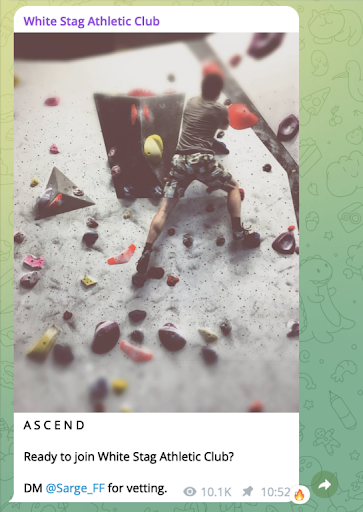 Shepherd is also pictured wearing these shorts in a promotional photograph posted in the White Stag Telegram channel on another occasion. Prospective members are told to direct message @Sarge_FF for vetting in a post accompanied by a photograph of Shepherd on a climbing wall. “Sarge” is one of the pseudonyms used by Podsiad-Sharp. Shepherd can be seen wearing the same expensive Tenaya Oasi climbing shoes in a video posted on the PA Fitness club channel, where he shows his face (below, right).