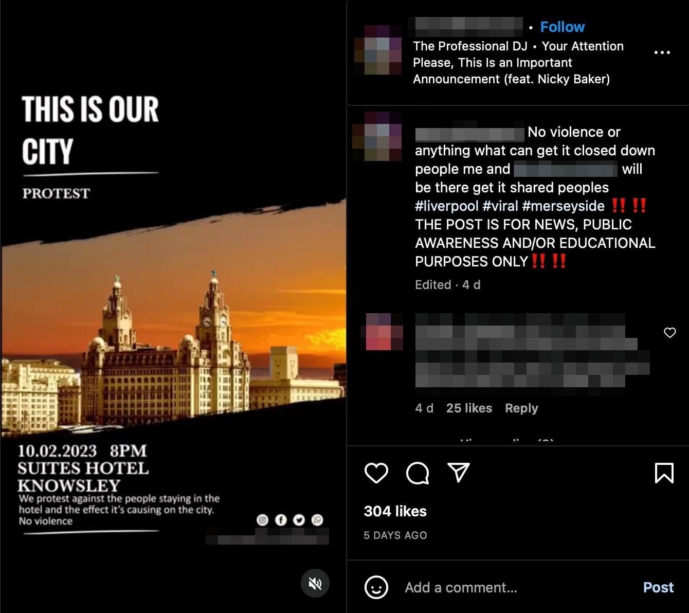 On Friday night a protest against migrants being housed in a hotel in Knowsley, Liverpool, turned violent and a police van was set on fire. The protest followed rumours of sexual harassment by someone alleged to be a resident at the hotel. Fascist party Patriotic Alternative (PA) claim to have distributed hundreds of leaflets about the hotel locally in the weeks prior to the protest, attempting to manufacture outrage and recruit to their cause. Early reports claimed PA were responsible for organising the protest but this is not the case. While PA activists were present, they are not capable of organising riots and have limited experience of public order situations. In fact, the protest appears to have initially been called by two local Instagram pages, not previously affiliated with the organised far right, with a combined audience of almost 50,000 followers on the platform.